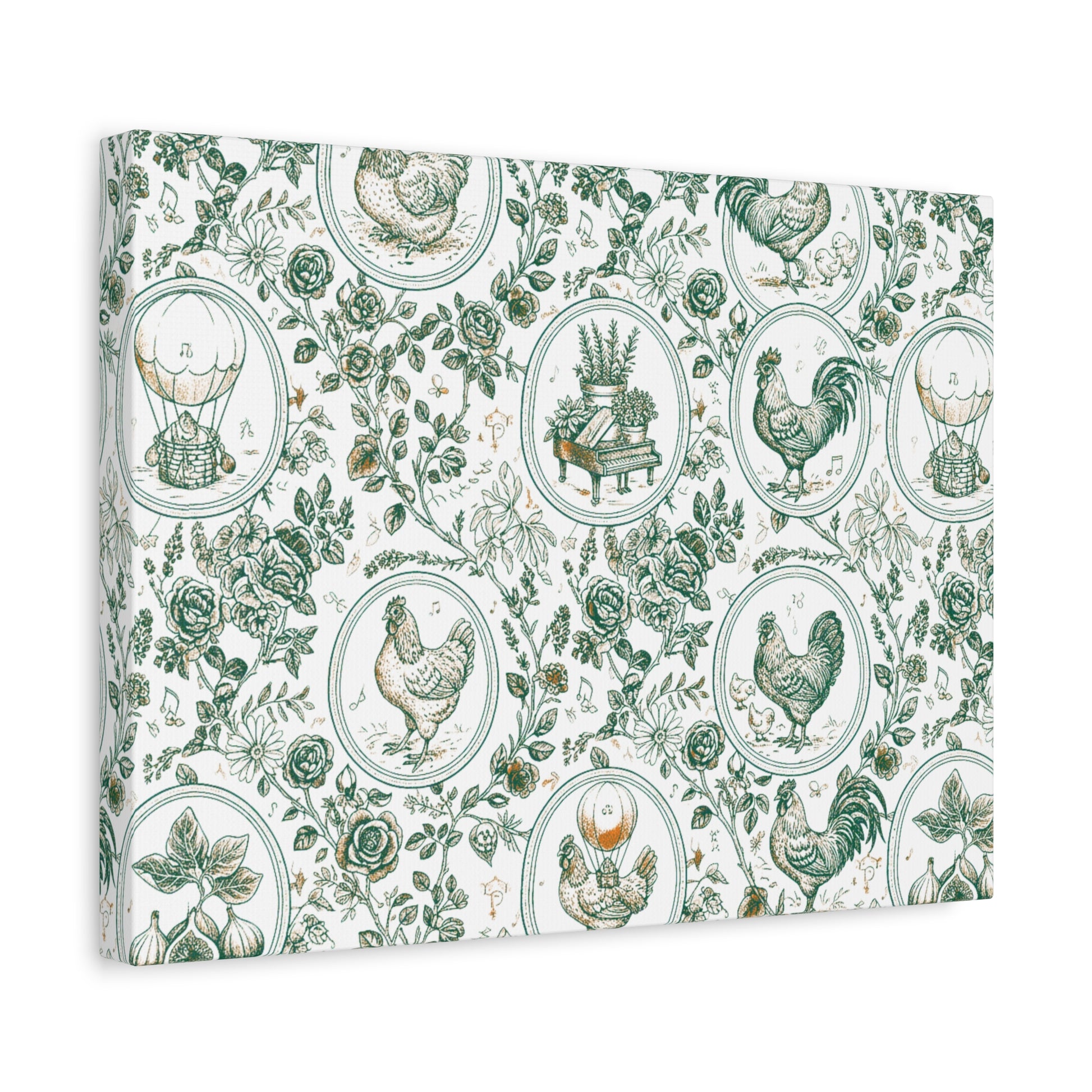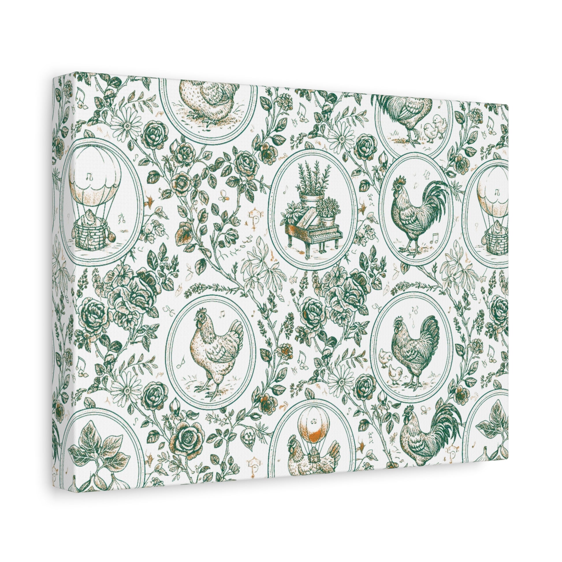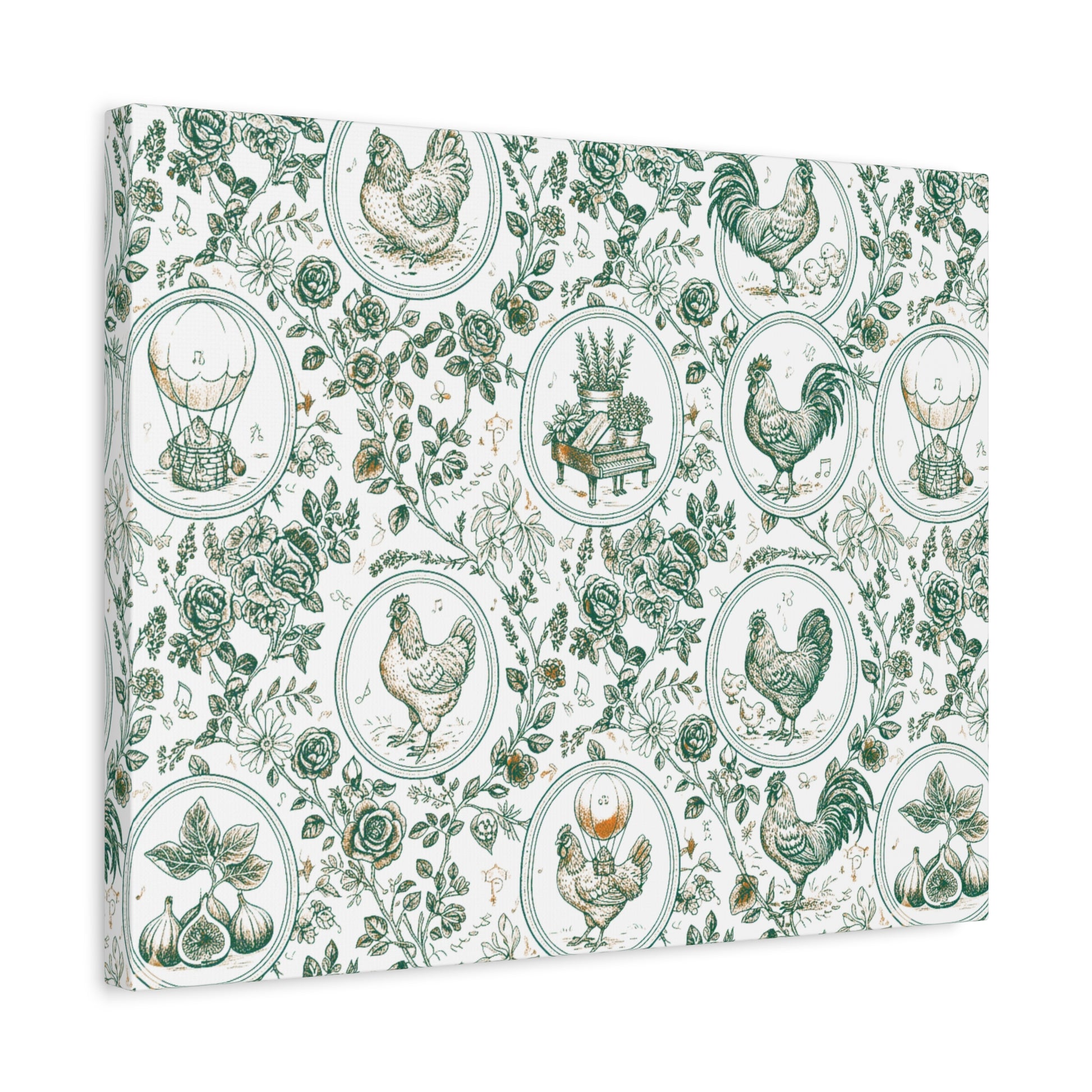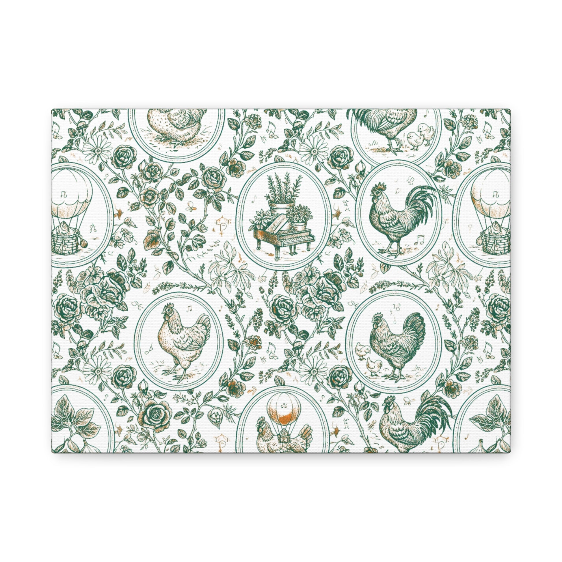 Who said sophistication can't have a sly wink and a cheeky cluck? Our "Botanical Coop Toile" Matte Canvas transforms any wall into a gallery of discerning wit and unexpected charm. We've hijacked the hallowed halls of traditional French Toile de Jouy, replacing its usual pastoral fluff with our utterly captivating, chicken vignettes. Behold a meticulously rendered world of roosters strutting, hens gossiping, and chicks cavorting amidst an exquisite botanical symphony of climbing vines, delicate lavender, and vibrant calendula blooms. It’s classical elegance with an undeniable Page and Blossom edge.