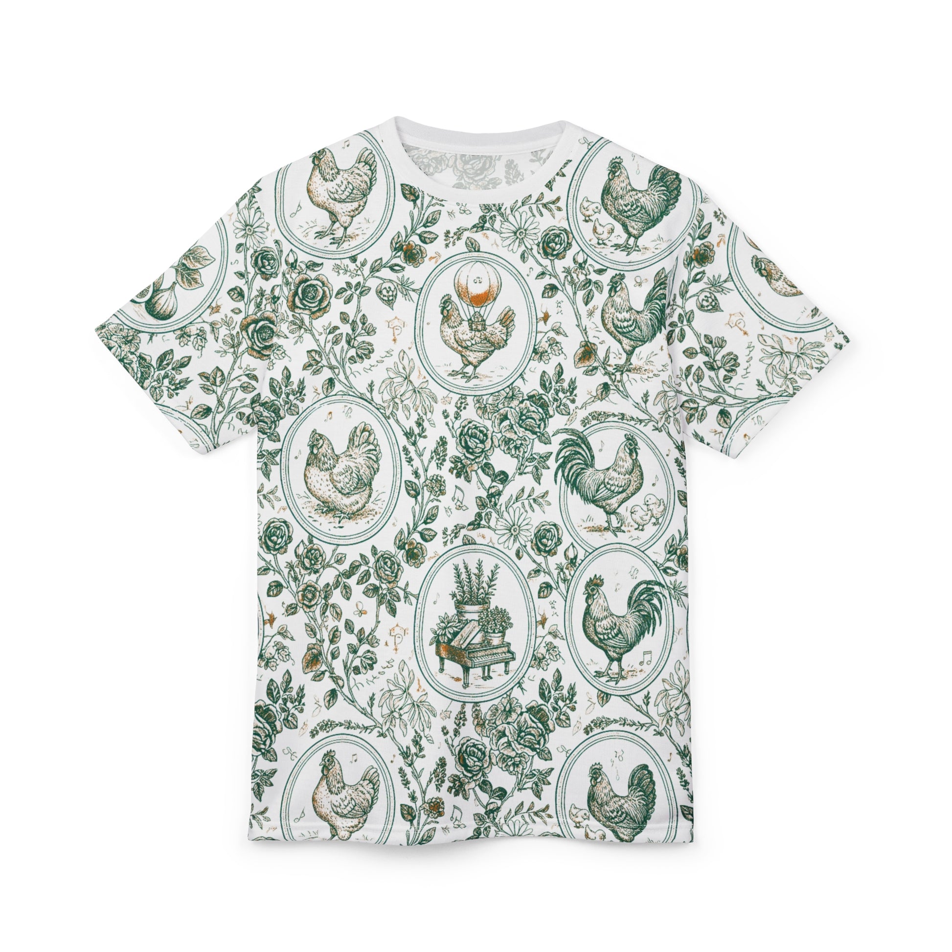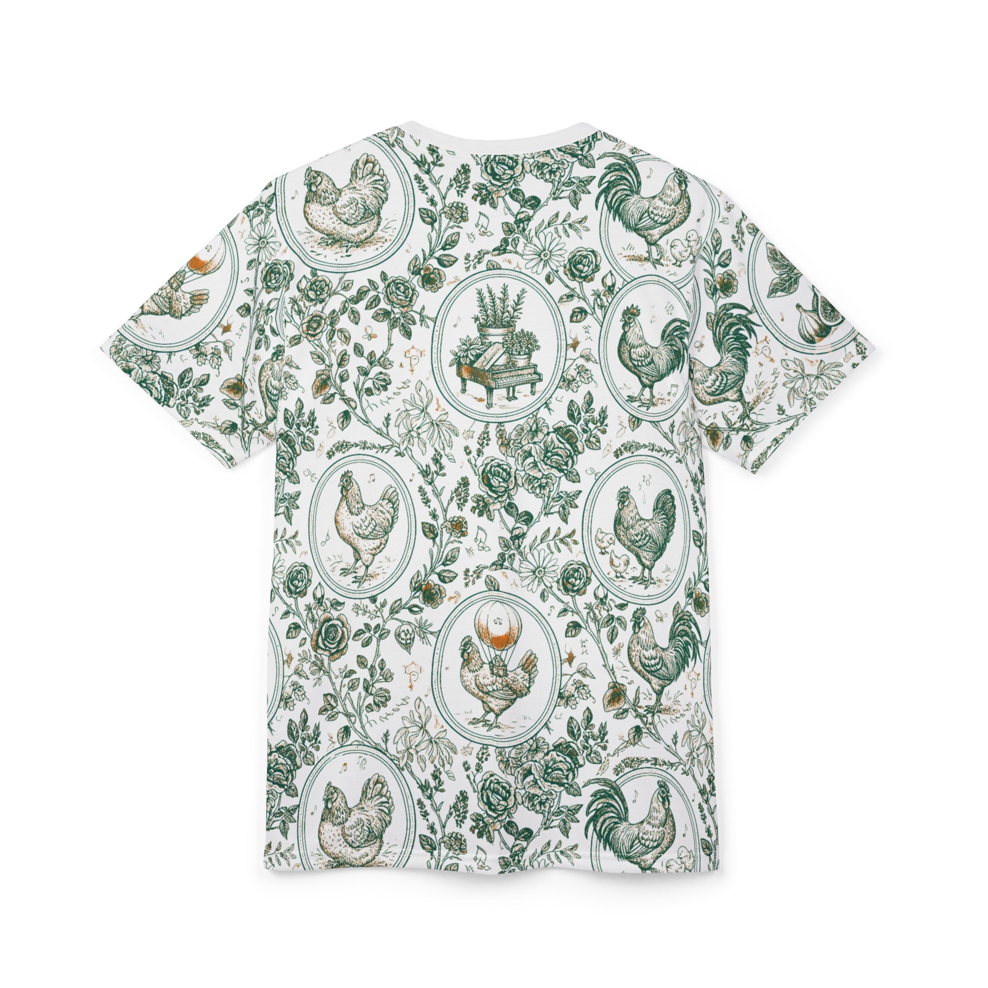 Classic French toile just got a barnyard glow‑up. The Botanical Coop Toile swaps pastoral picnics for a series of charming chicken vignettes — hens dust‑bathing under roses, perched on herb planters, or pecking at fallen figs — all entwined with climbing vines, fragrant lavender sprigs, and sunny calendula blooms. Rendered in a refined two‑tone palette, it’s the kind of print that looks couture from across the room, but rewards a closer look with its playful, unexpected details.