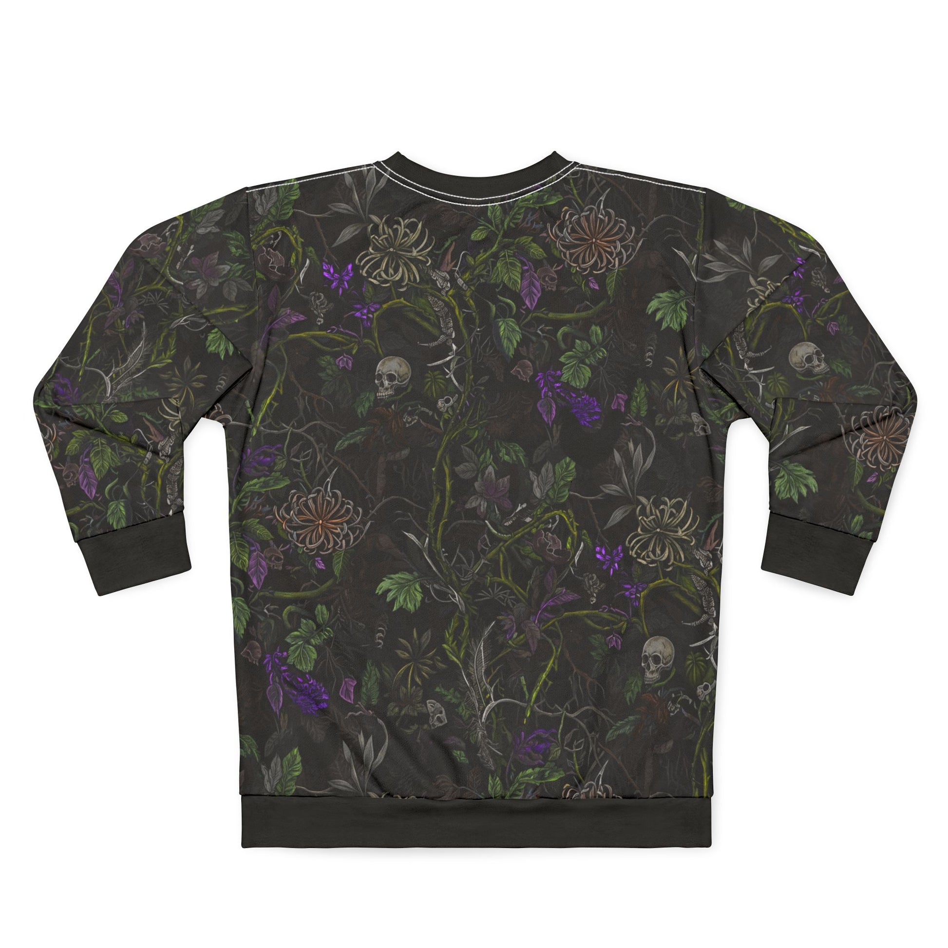 Some gardens aren't for the faint of heart. Our "Nocturne Bloom" All-Over Print Sweatshirt invites you into a world where beauty is both breathtaking and a little bit ominous. This isn't just foliage; it's an intricate, dense tapestry of thorny vines, shadowy blooms, and secret whispers. Look closer, and you'll discover delicate bird skulls, skeletal fragments, and ancient thorns entwined within the rich, dark botanicals – a true Page and Blossom masterpiece that whispers tales of what truly grows in the witching hour.