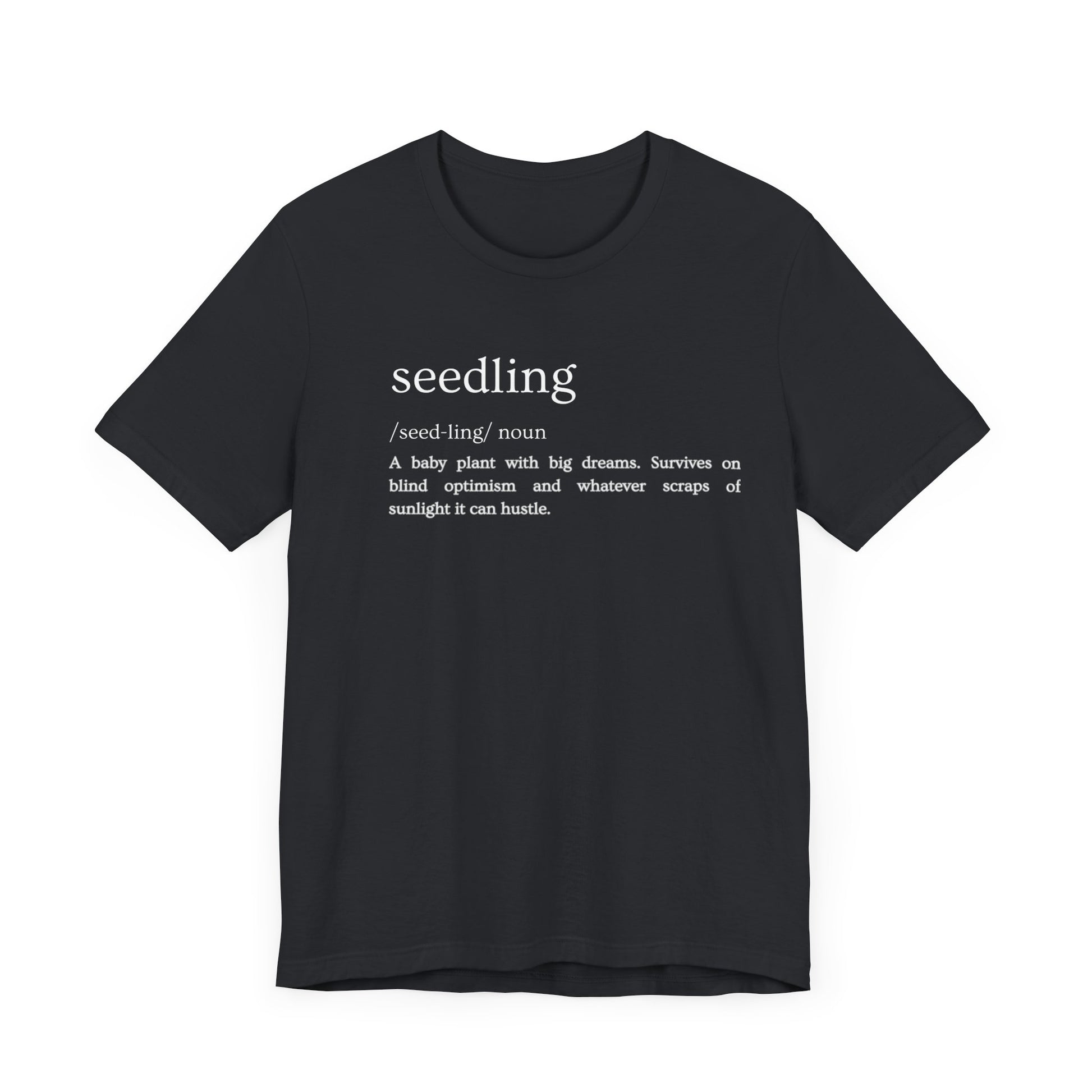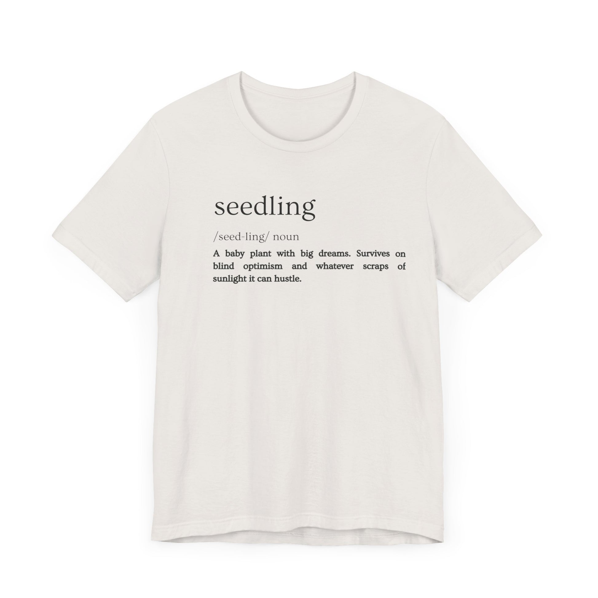 Every gardener knows the feeling: you look at that tiny little green thing, barely poking out of the soil, and you just know it's got big plans. Seedlings are the ultimate optimists, powered by pure potential and whatever weak sunbeam they can beg, borrow, or steal. If you appreciate a good underdog story (or just relate to the daily grind of trying to thrive), this shirt is for you. Wear it and honor the little giants of the garden!