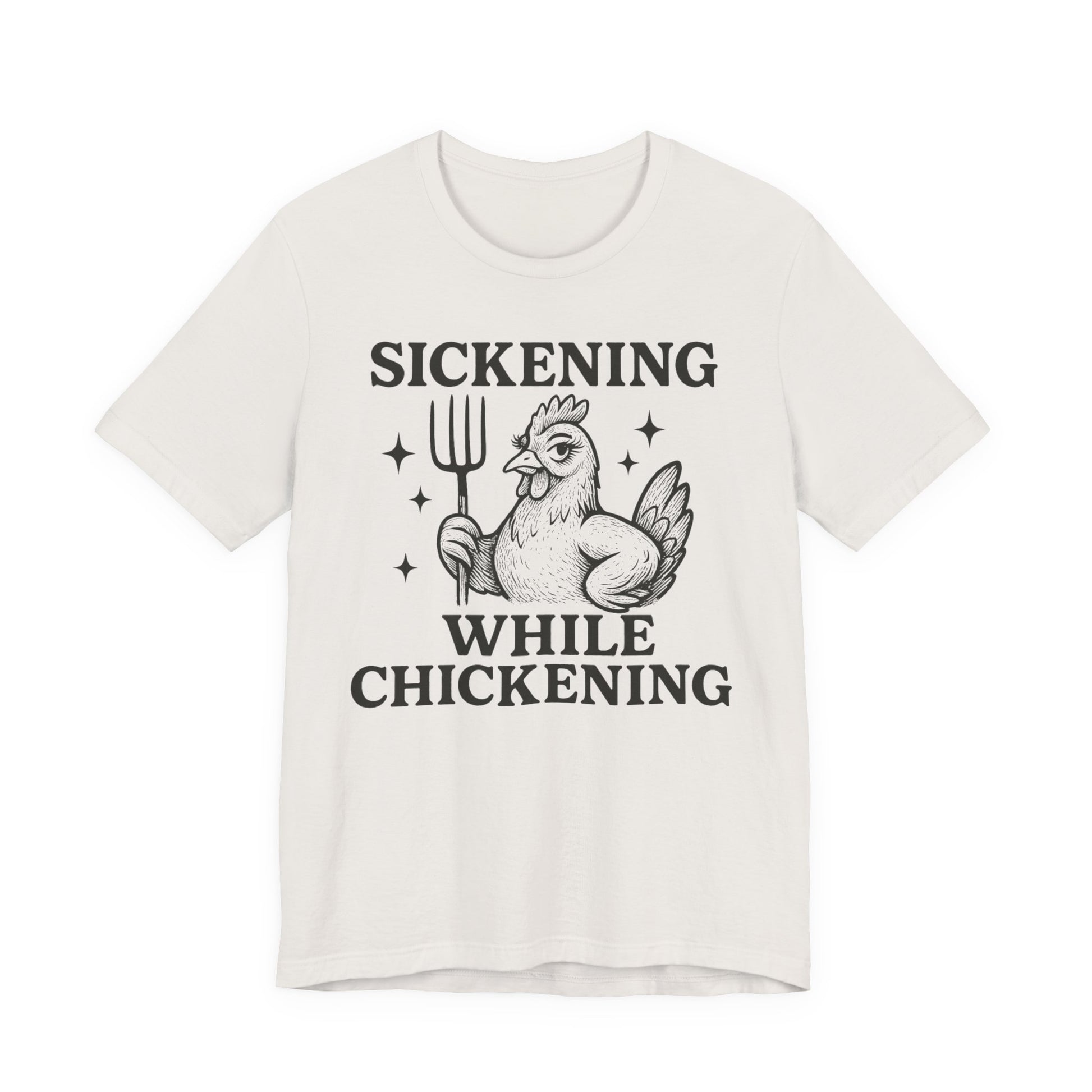 - "Sickening While Chickening" Graphic: The star of the show! Our unimpressed chicken with a pitchfork and the cheeky phrase will be your new go-to for making a statement without saying a word.