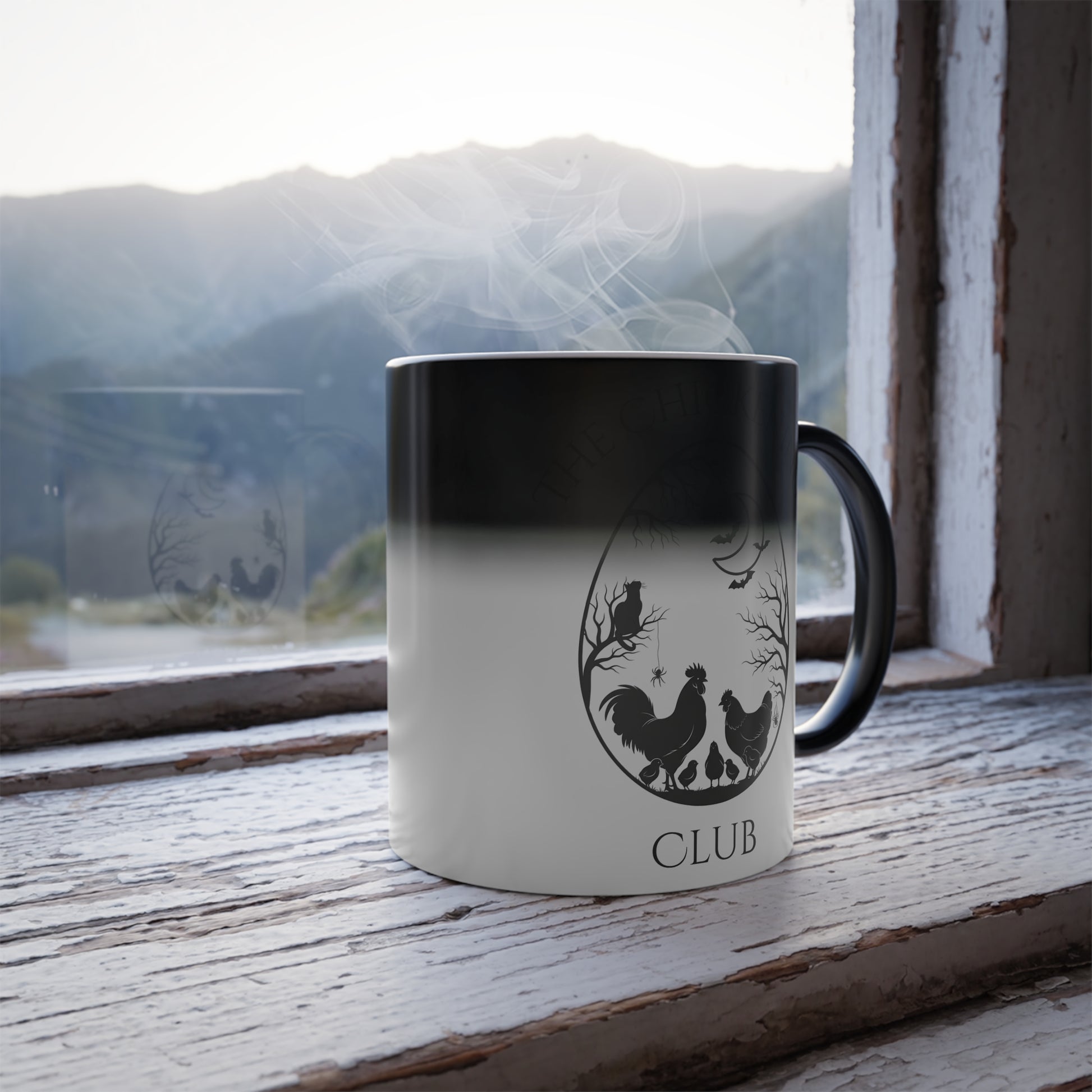 This mug doesn’t just change color — it changes vibes. Featuring the exclusive Chickening Club Halloween Edition emblem, this ceramic shapeshifter reveals its true plumage when filled with something hot and sinister (or just your morning coffee). One second it’s sleek and mysterious, the next it’s cackling with vibrant hues that scream “witchy chicken coven meets caffeine cult.”