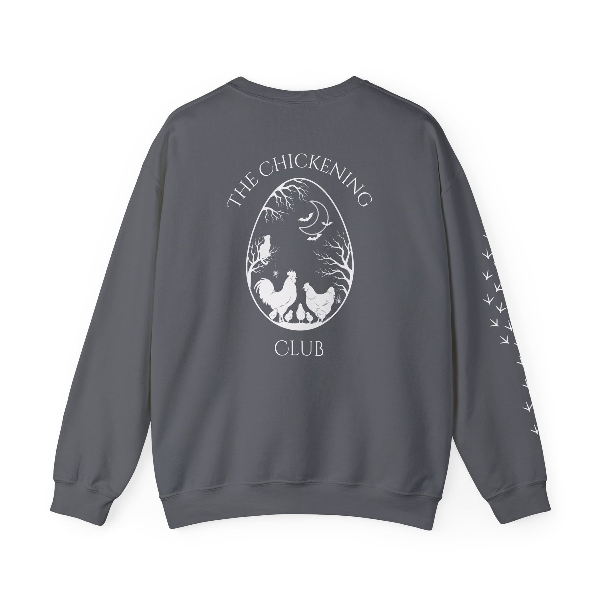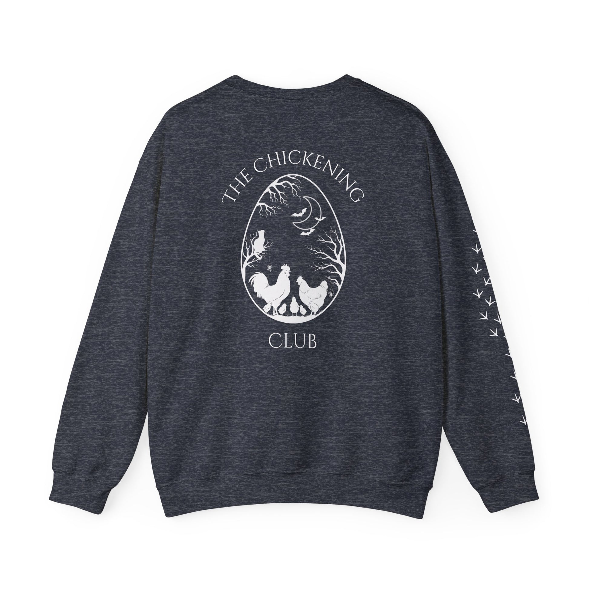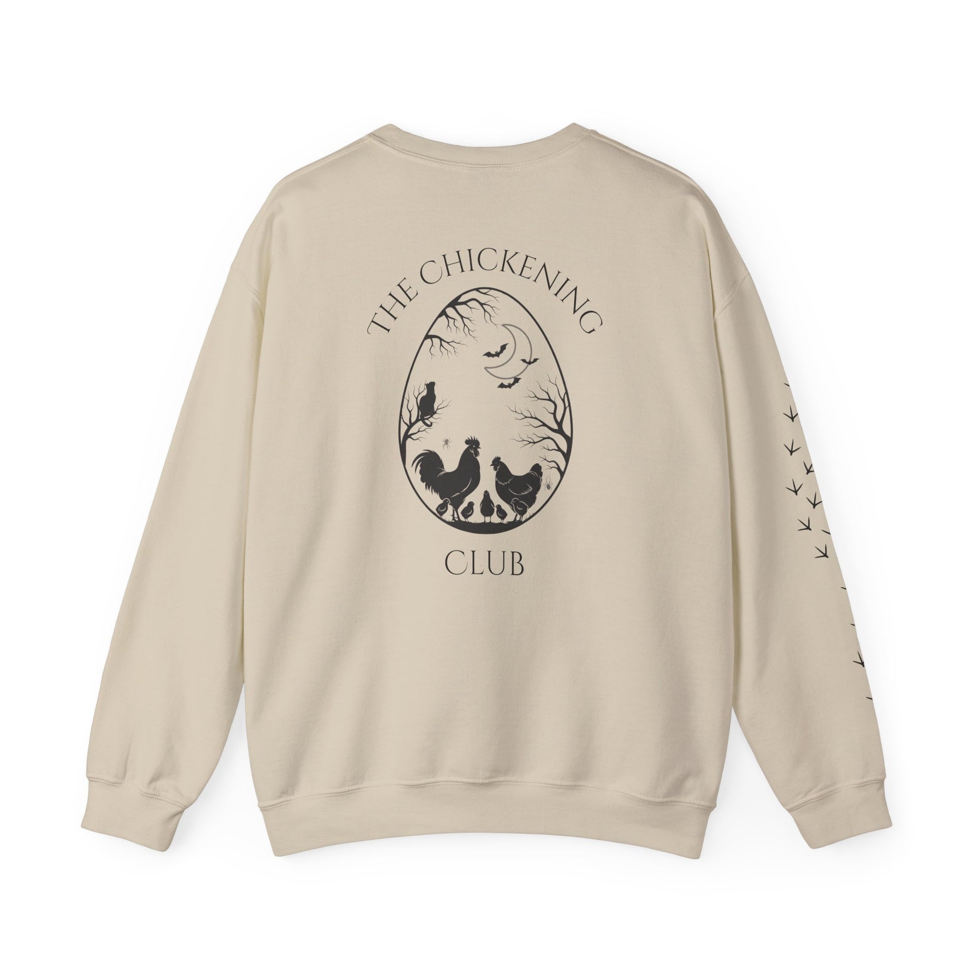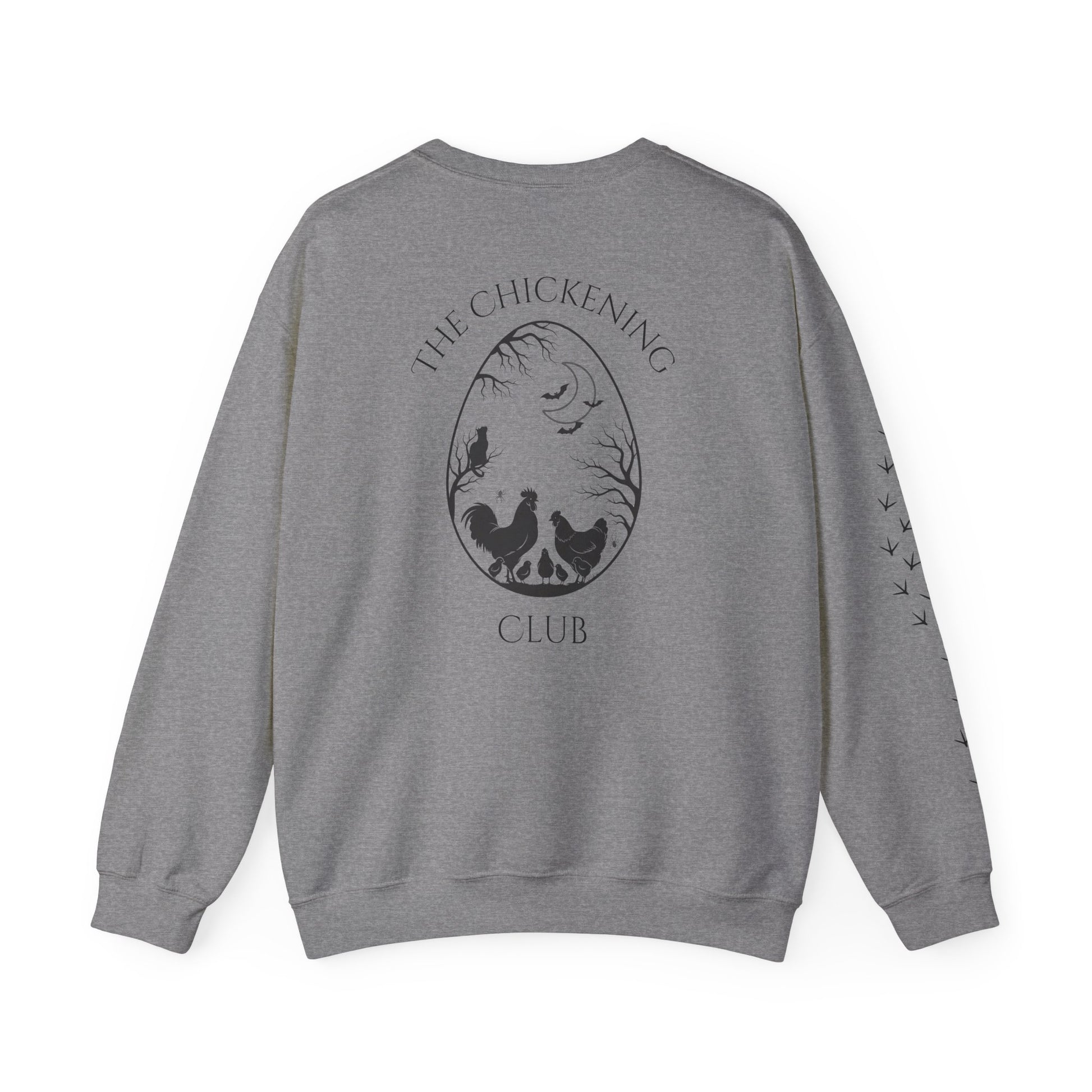 Welcome to The Chickening Club: Halloween Edition — where feathers meet fright and cozy meets cryptic. This unisex Heavy Blend™ crewneck sweatshirt features our signature egg-shaped emblem, now haunted with seasonal flair: a chicken family huddled beneath a crescent moon, flanked by bats, gnarly trees, and a couple of spiders who clearly didn’t RSVP but showed up anyway.